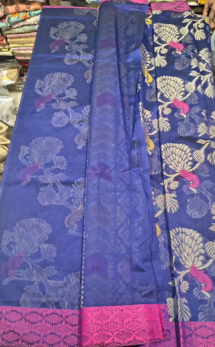 Add timeless elegance to your ethnic collection with this beautiful Baluchari Cotton Saree, crafted in a rich deep blue shade with intricate traditional woven motifs. This saree features classic Baluchari-inspired designs along with contrasting zari work borders that enhance its royal appeal.