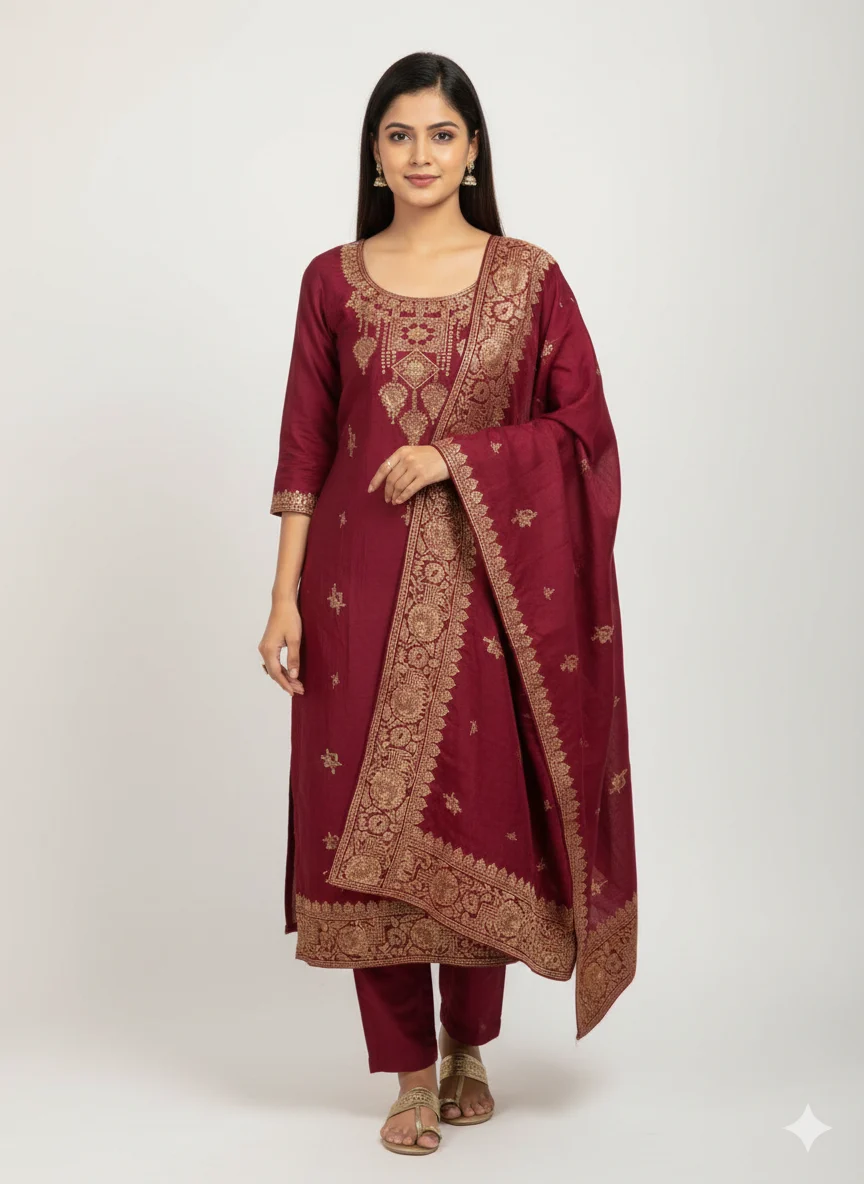 Enhance your festive wardrobe with this elegant Dola Silk Unstitched Suit Set. Crafted from premium Dola silk, the kurta fabric features rich zari work that adds a royal and graceful touch. The set comes with a beautifully coordinated Dulha silk dupatta and a comfortable glace cotton bottom, making it ideal for weddings, festivals, and special occasions.