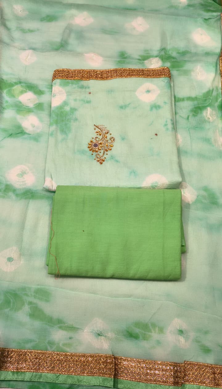 The set is paired with a lightweight Chiffon Dupatta, which adds a flowy, elegant drape and elevates the overall look of the outfit. The subtle dye pattern and soft finish of the dupatta make it suitable for both daily and festive wear. Completing the set is a Plain Cotton Bottom, offering ease of stitching, durability, and all-day comfort.