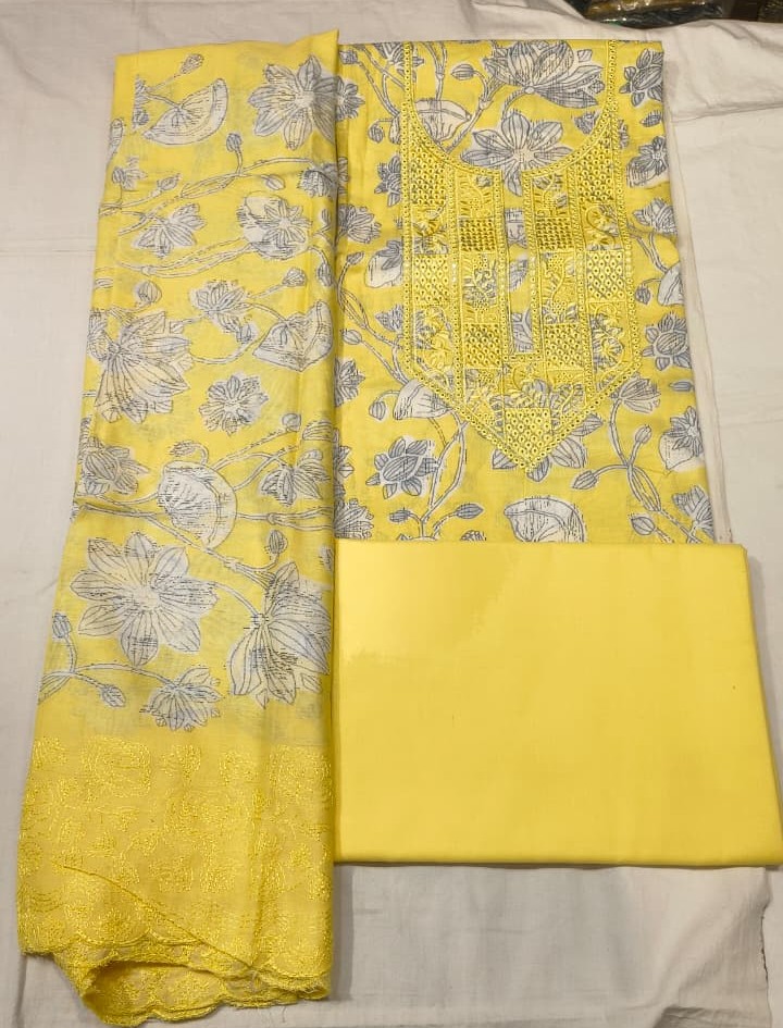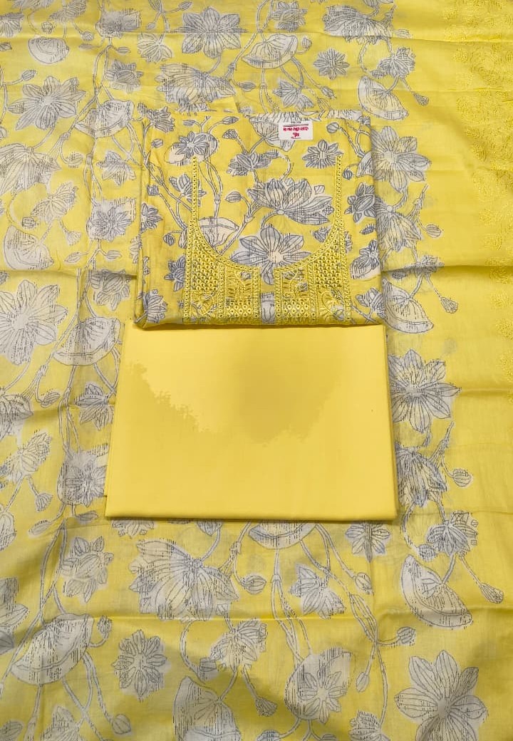 This unstitched cotton suit set is suitable for daily wear, office wear, casual outings, festive gatherings, and summer occasions. Its fresh yellow tone and elegant design make it a must-have for a stylish ethnic wardrobe.