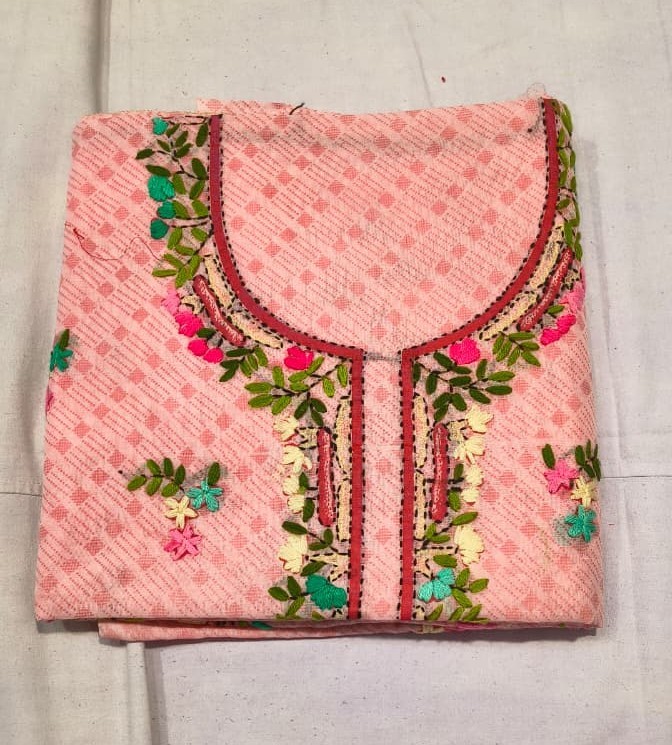 This Premium Garhwal Cotton Unstitched Suit Set is a perfect combination of traditional craftsmanship and everyday elegance. The suit fabric is made from soft and breathable Garhwal Cotton, beautifully highlighted with intricate moti work embroidery on the neckline featuring circular and floral motifs that give the outfit a graceful ethnic appeal.