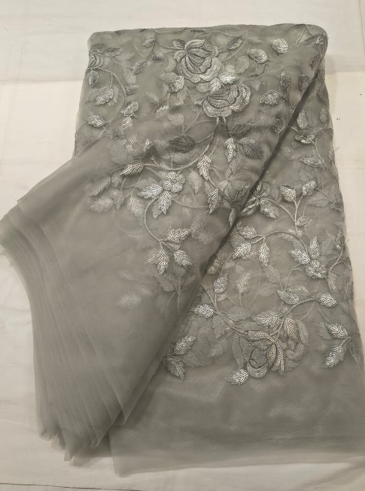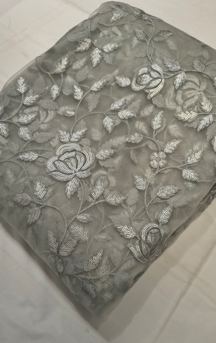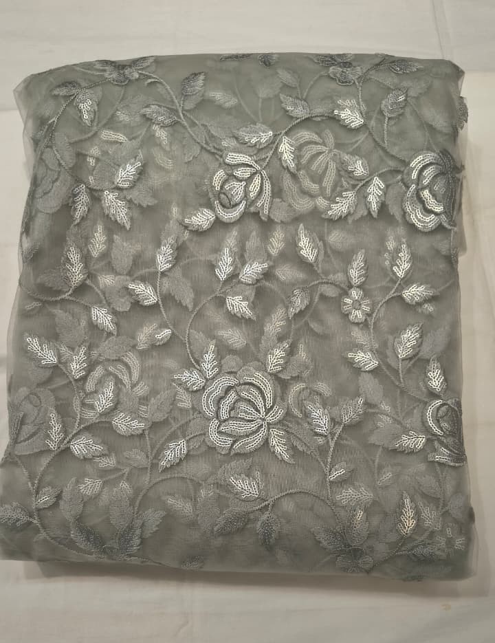This Premium Net Embroidery Fabric is designed to add elegance and sophistication to your ethnic and party wear collection. Crafted in a classy grey shade, the fabric features beautiful all-over floral embroidery with fine thread and sequin detailing, giving it a rich and graceful look.