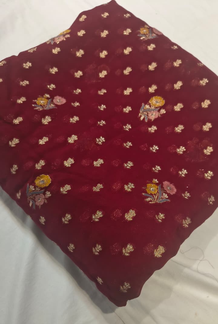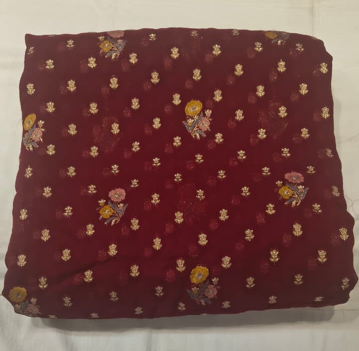 This Premium Organza Multicolor Zari Work Fabric is crafted to give a rich and elegant ethnic look. Designed on a deep maroon organza base, the fabric is beautifully adorned with fine gold zari butti work along with subtle multicolor floral motifs, creating a luxurious and festive appearance.