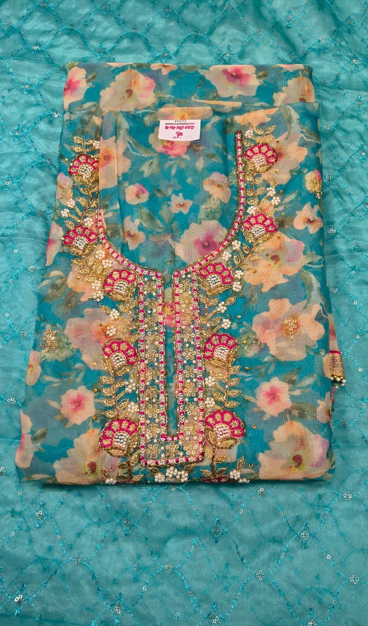 This Premium Organza Unstitched Suit Set is designed for women who love elegant, festive, and statement ethnic wear. The suit top is crafted from sheer organza fabric and beautifully enhanced with rich floral embroidery, zari work, beads, and stone detailing on the neckline and front panel. The intricate craftsmanship gives the outfit a luxurious and graceful appeal.